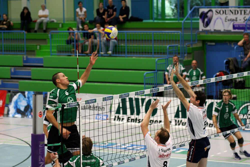 30.10.07 - Klarer 3:0-Sieg gegen die Hamburg Cowboys - Nach nur 66 Minten konnte der SV Bayer einen 3:0-Sieg bejubeln. Grundlage hierfür waren druckvolle Aufschläge (u.a. Pena) und in den wichtigen Phasen stand der Block. Auf der anderen Seite profitierte der SV Bayer im 1.Satz, beim 25:12, von einem sehr schwachen Gegner. In der Startsieben stand neben Sebastian Kühner auf der Zuspielposition der wieder fitte Tomas Plichta. Beide zeigten ein sehr gutes Spiel, konnten aber nicht verhindern, das Hamburg im 2.Satz einen besseren Start gelang. Anfangs führte der Gast (6:4), doch dann kamen wieder die Hausherren besser ins Spiel und zeigten dem Gegner durch seh druckvolles Spiel die Grenzen auf. Ein Zwischenspurt bei 14:14 brachte den SV Bayer auf 22:16 in Führung und das 25:19 war nie gefährdet. Eine Aufschlagsserie von dem wieder sehr gut aufgelegten Florian Wilhelm sorgte für einen Blitzstart (5:0) im 3.Satz, doch die Hamburg Cowboys kamen noch mal ran und glichen beim 14:14 aus. Dann machte der SV Bayer wieder ernst und über 17:15 und 22:18 wieder deutlich inn Front. Auch ein kurzes Aufbäumen der Gäste zum 23:21 konnte wenig später das 25:22 und den 3:0-Sieg nicht mehr gefährden.
