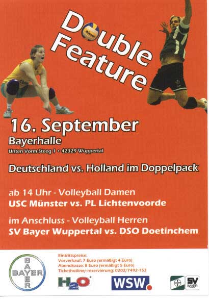 Sonntag, 16.09.07 - "DOUBLE FEATURE 07" - Herren 1 in der Bayerhalle gegen DOC SO Doetinchem (NL) / vorher Damen USC Münster gegen Lichtenvoorde (NL) - Im Rahmen des "Sommerfest" des SV Bayer findet eine hochkarätige Volleyballveranstaltung in der Bayerhalle statt. 2x GER gegen NED!