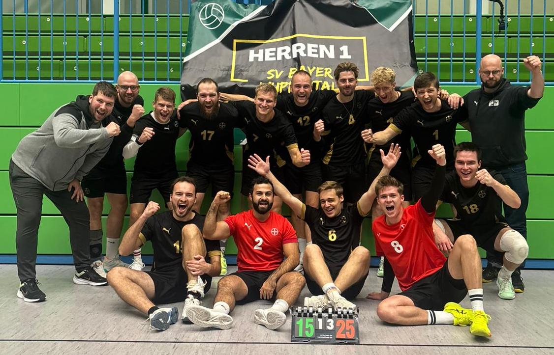 05.10.25 - Herren 1 gewinnen zu Hause 3:1 gegen den Verberger TV - Satz 1 ging mit 25:23 an die Gastgeber, die auch von einer lauten Unterstützung in der Bayerhalle profitierten. Nachdem Verberg Satz 2 gewinnen konnte (21:25) wurde Bayer stärker und profitierte von Fehlern des Gegners, die dem Druckvollen Spiel der Gastgeber nun nicht mehr standhalten konnten. Mit 25:19 und 25:15 ging das Spiel an den SV Bayer. Sehr zur Freude der lautstarken Fans.